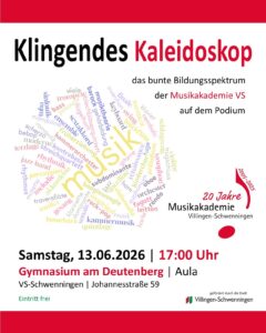 Ein Kaleidoskop zeigt ein buntes Allerlei von Farben und Formen. In unserer klingenden Variante präsentieren wir das bunte Spektrum unserer musikalischen Ausbildungsvielfalt auf der Bühne: Von der musikalischen Früherziehung über den frühen Instrumentalunterricht, die Stimmbildung und Ensemblearbeit bis hin zu den erfolgreichen Teilnehmern beim musikalischen Wettbewerb „Jugend musiziert“, die Begabtenförderprogramme „PreCollege“ und „Studienvorbereitende Ausbildung“ sowie die Musizierangebote für den dritten Lebensabschnitt bietet die Musikakademie VS eine große Bandbreite an Möglichkeiten der musikalischen Ausbildung und Freizeitgestaltung für musikbegeisterte Menschen jeden Alters. Auf einem Podium versammelt, ergibt das ein höchst vielseitiges, abwechslungsreiches und unterhaltsames Konzertprogramm.