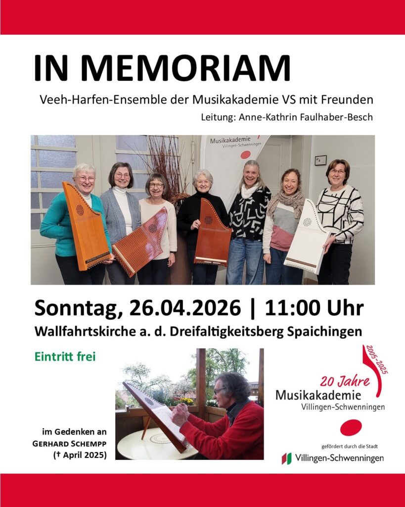 IN MEMORIAM Gerhard Schempp Mit einem Konzert in der Wallfahrtskirche auf dem Dreifaltigkeitsberg bei Spaichingen würdigt unser Veeh-Harfen-Ensemble am 26.…